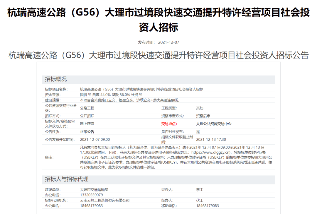 6月28日,大理市交通运输局发布了《大理市南片区绕城快速交通系统项目工程可行性研究报告编制、两阶段勘察设计公告》。