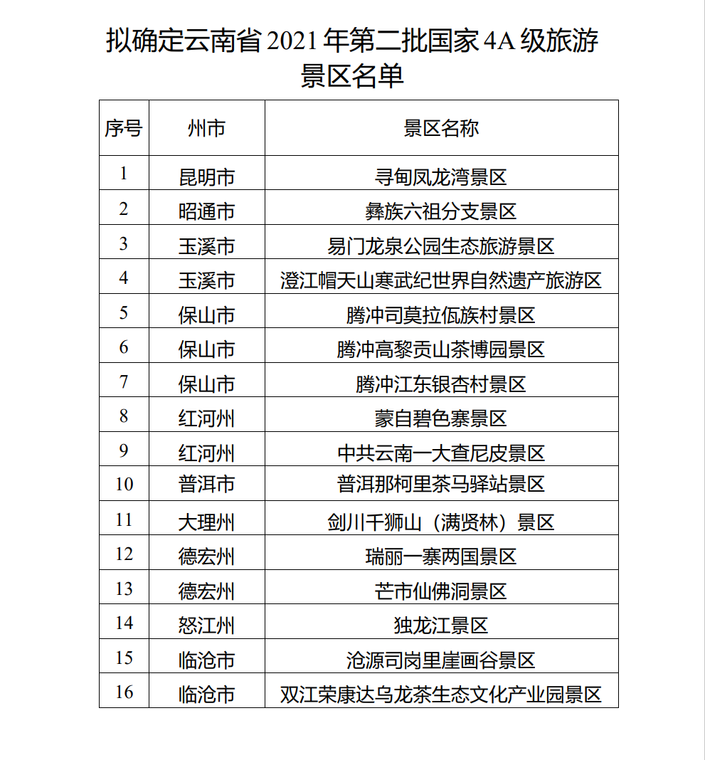 ※16家景区拟确定为云南省2021年第二批国家4A级旅游景区