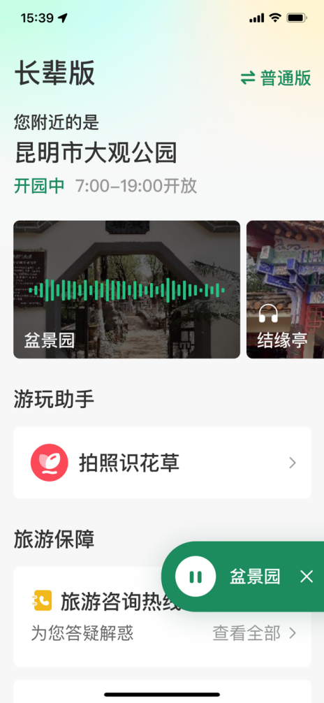 “长辈模式”结合中老年群体的使用习惯,仅在标准版基础上保留了银发人群最常用的两个功能板块——“游玩助手”及“旅游保障”,帮助其更方便快捷地使用景区导览、拍照识花草、投诉退货等功能。根据老年群体不爱看文字,更喜欢语音图像等的操作习惯,景区导览功能重点聚焦语音讲解,并根据老年人的位置推荐不同的景区讲解,讲解语音在当前页面即点即播,清晰简单。