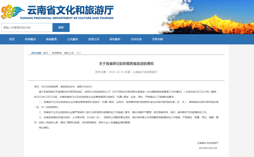 12月15日,云南省文化和旅游厅发布关于恢复跨省旅游的通知,自2021年12月15日起,恢复我省旅行社及在线旅游企业经营跨省团队旅游及“机票+酒店”业务。全文如下:
