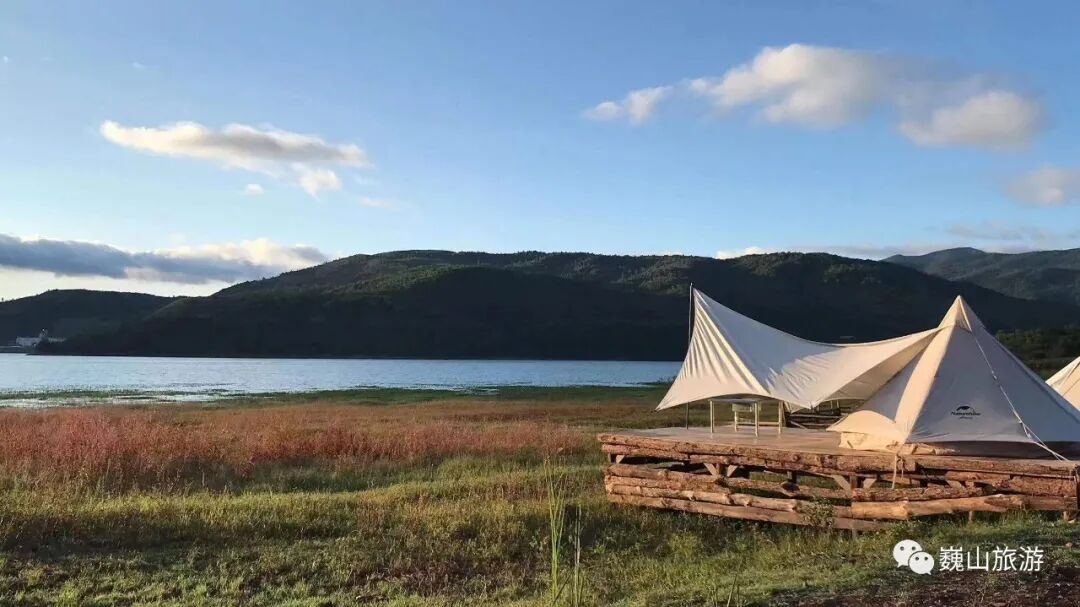 我沿湖走了一圈回来,鞋已湿了,是我惊扰了清晨顶在草尖的露珠。太阳越过山体,从木屋后面的竹林探出红彤彤的脸。竹林随风晃动,太阳便如金子般忽闪忽闪,透出柔和、温暖、明亮的光线。阳光的温暖唤醒了林中的鸟儿,清脆嘹亮的歌声在山谷此起彼伏。朝阳映照着露珠,让整片草地闪耀着晶莹的光。一位戴着草帽的妇女赶着几头牛吆喝着从田间走了过来。调皮的小牛冲在前面,摇头摆尾地径直向木屋方向走来,在距离我几十米的地方停了下来,歪着头好奇地望着我们这些花花绿绿的帐篷。一脸呆萌。只听后面一头大牛低沉的叫唤了几声,小牛马上调头跑向队伍,甩着尾巴跟随牛群向山那边而去。