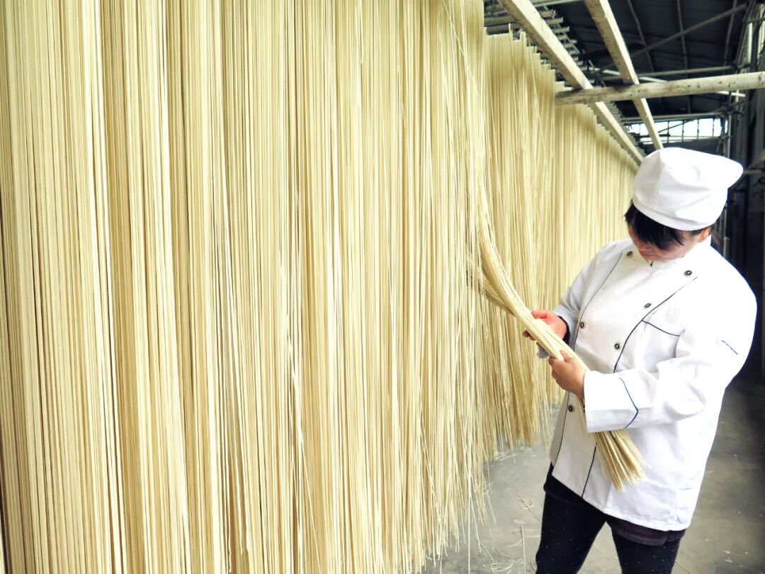 为了探访它的神秘“配方”和历史,记者走进位于杨广镇的锦兴食品厂,首先映入眼帘的是厂房里整整齐齐挂着的面条。锦兴食品厂的员工正在一排一排的面条之间穿梭,一位女工时而捏起一把面条反复触摸,时而又低头闻一闻面条的味道。听了锦兴食品厂负责人的介绍才知道,原来她在通过这样的方式判断面条里的水分是否已经充分排出,这是她每天都要重复无数次的工作。