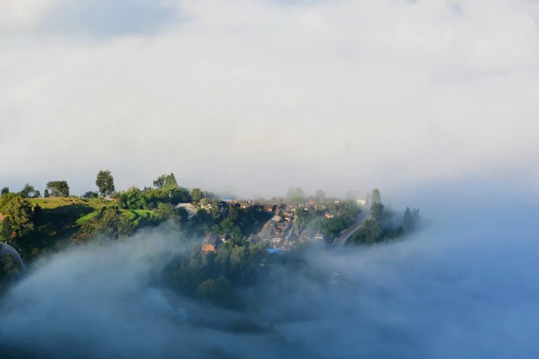 随着太阳缓缓升起,慢慢地,层层云雾被风儿扯成一丝丝一缕缕,阳光放肆地穿透云层,沉睡在谷底的拾光小镇——绿汁被温柔唤醒,逐渐显现出小镇的迷人风姿。初见云海时那气势磅礴的绰约之景悄然散去,化进蓝天白云之间。