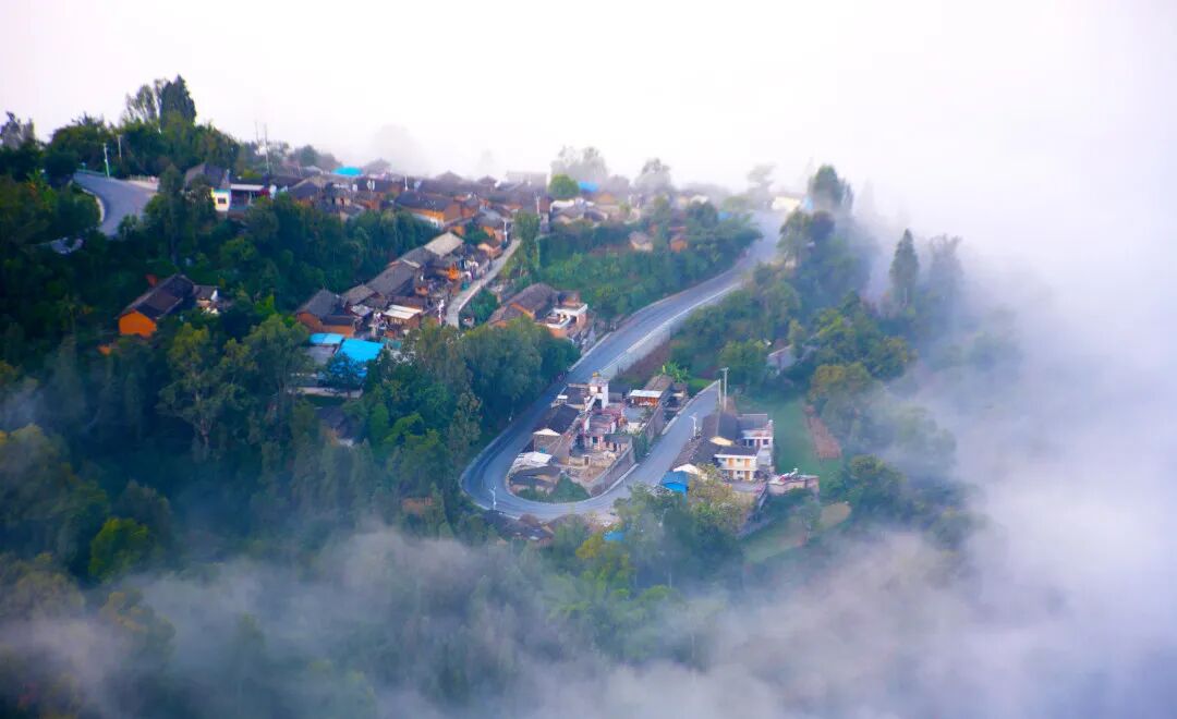 远处,绵延群山与丽日红霞交相辉映,云河绕着美丽村落激荡起伏,一副云蒸霞蔚,静谧悠远的迷人画卷尽收眼底。