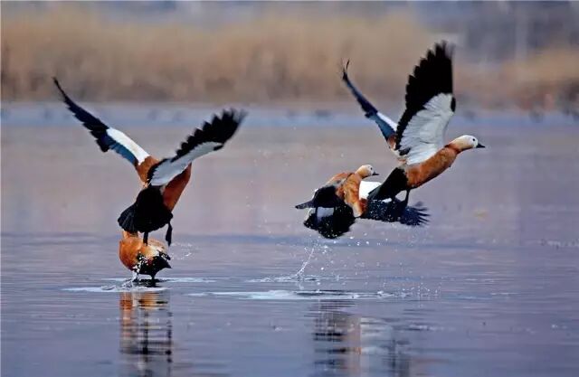 半空中,水面上,草丛里,随处可见那些鲜艳的翎羽和灵动的身影。戏水,翱翔,亦或是在岸边的树枝上静立,野鸭、灰雁、紫水鸡、小天鹅……落单的身形唯美,成群的飞舞震撼,冬日草海,变成这些可爱的鸟儿的舞台。