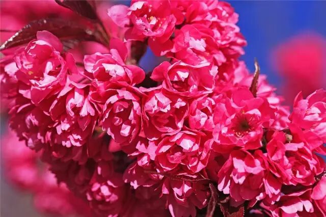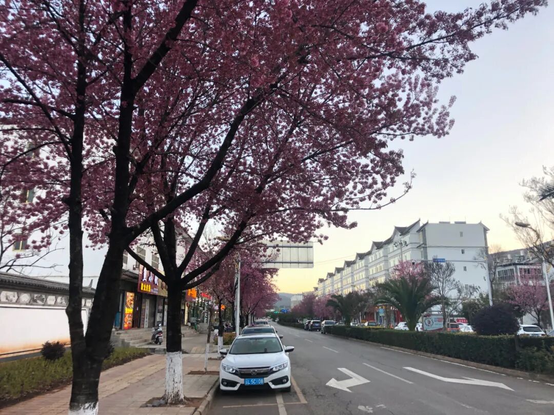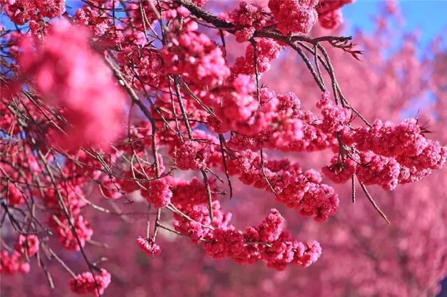 一树树樱花,如同绯红的火焰,仿佛要将冬日的冷冽消融,小小的花瓣密密匝匝,簇拥着细嫩的花蕊,一朵紧挨着一朵,团团簇簇地将所有枝条占满,那样绚烂而热烈。站在树下仰望,耀眼的阳光都被遮蔽,只从偶尔的间隙中透出一丝光晕,风摆树梢,摇下的花瓣似一场红色的大雪,覆盖了路面,占满了心头。
