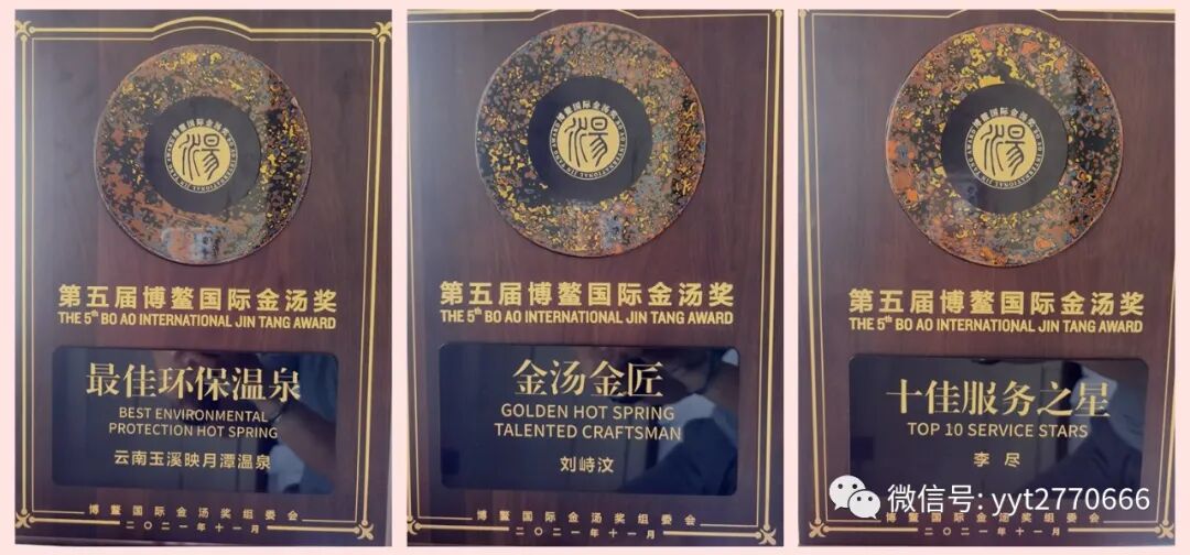 映月潭荣获了第五届博鳌国际金汤奖“最佳环保温泉”奖,总经理刘峙汶获“金汤金匠”奖,温泉前厅李尽获“十佳服务之星”奖!