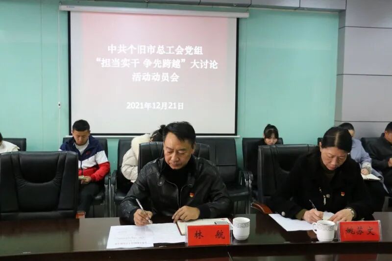 会议学习传达了州委、市委“担当实干 争先跨越”大讨论活动动员部署会议精神,对个旧市总工会开展大讨论活动进行了安排部署。