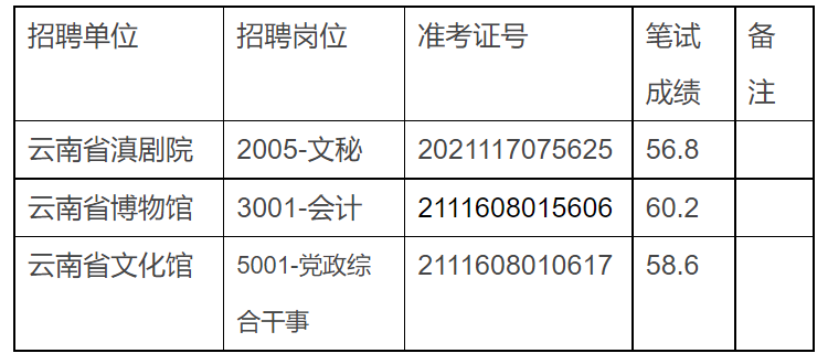 云南省滇剧院文秘岗位(2005)准考证号为2021117078227的考生、云南省博物馆会计岗位(3001)准考证号为2111609022219的考生、云南省文化馆党政综合干事岗位(5001)准考证号为2111609024827的考生因个人原因,自愿放弃面试。按照公告规定,经过招聘单位再次资格复审,递补人员进入面试。具体面试人员详见面试递补人员名单。