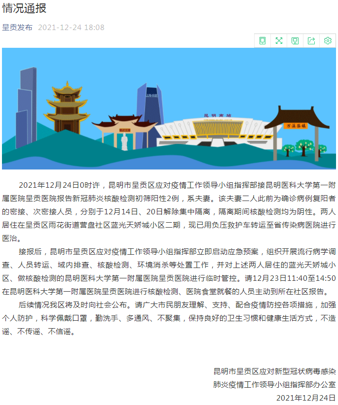 2021年12月24日0时许,昆明市呈贡区应对疫情工作领导小组指挥部接昆明医科大学第一附属医院呈贡医院报告新冠肺炎核酸检测初筛阳性2例,系夫妻。该夫妻二人此前为确诊病例复阳者的密接、次密接人员,分别于12月14日、20日解除集中隔离,隔离期间核酸检测均为阴性。两人居住在呈贡区雨花街道营盘社区蓝光天娇城小区二期,现已用负压救护车转运至省传染病医院进行医治。