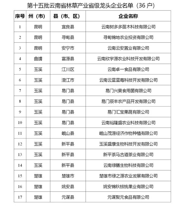 根据《云南省林草产业省级龙头企业认定和管理办法》(云林规〔2020〕6号)文件精神,经州(市)推荐、专家评审和局党组审定,拟认定云南树多多苗木科技有限公司等36户企业为第十五批省级林草龙头企业。现予以公示。