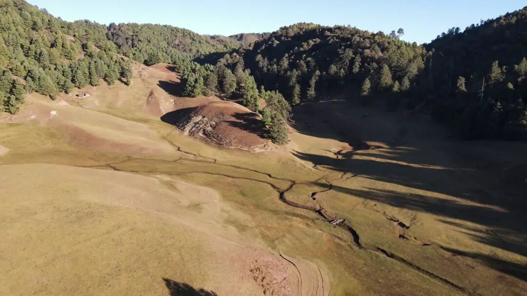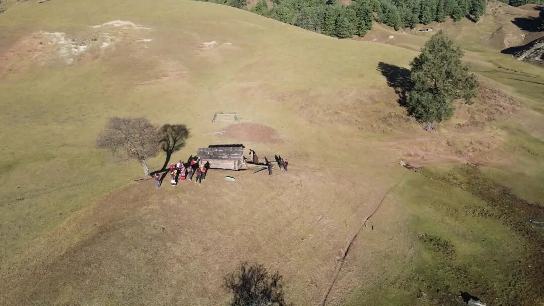 天子山下的大草甸,已经披上金色的外衣。草甸四周青山幽幽,苍松翠柏形态各异,与金色草甸交相辉映。