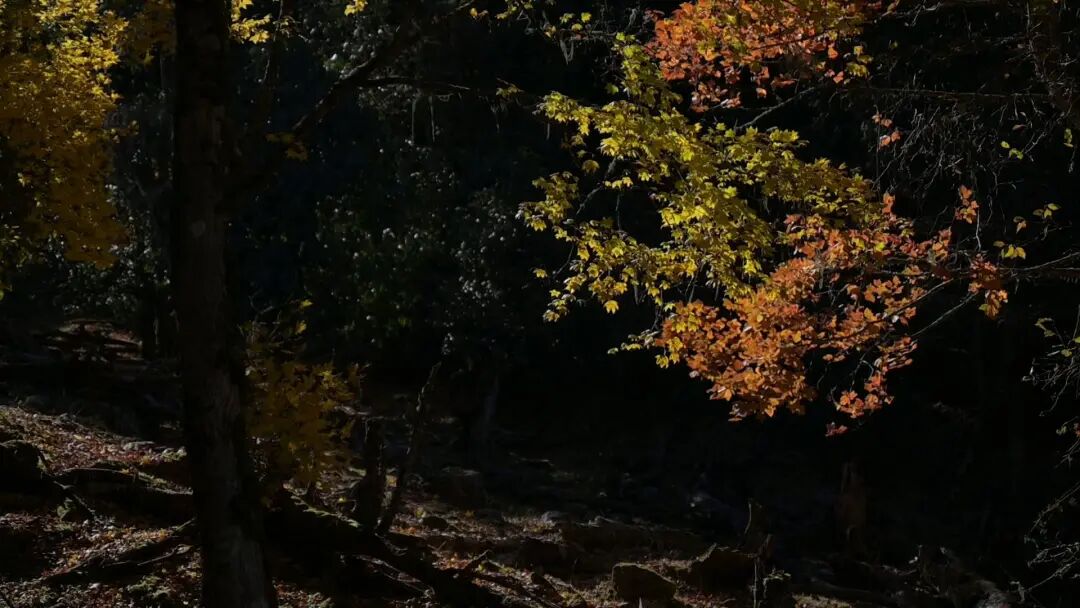 天子山山高林密,百年老树高大挺拔,落黄已经铺满山间小路,眼下漫山遍野的枫叶最为耀眼。
