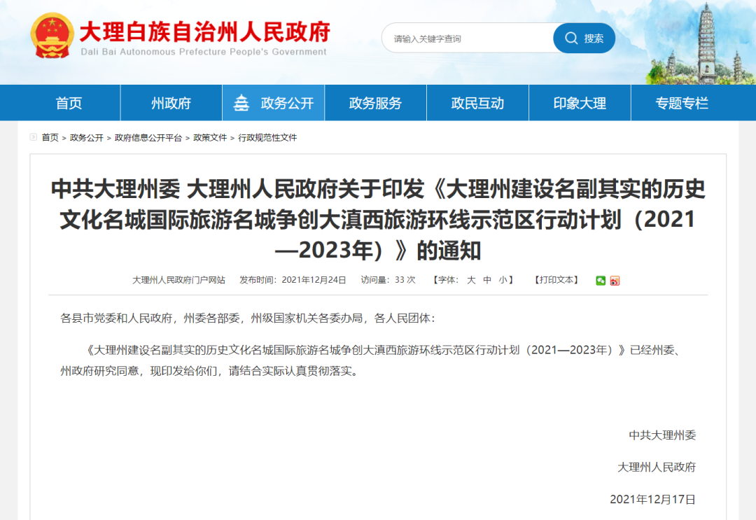 (一)第一阶段(2021年):紧紧围绕建设名副其实的历史文化名城、国际旅游名城和打造世界级文旅产业的部署要求,结合《大理州贯彻落实省委省政府大理现场办公会议工作安排部署任务分解方案》中关于文化旅游工作的目标任务,进一步建立完善工作机制、强化工作措施落实。