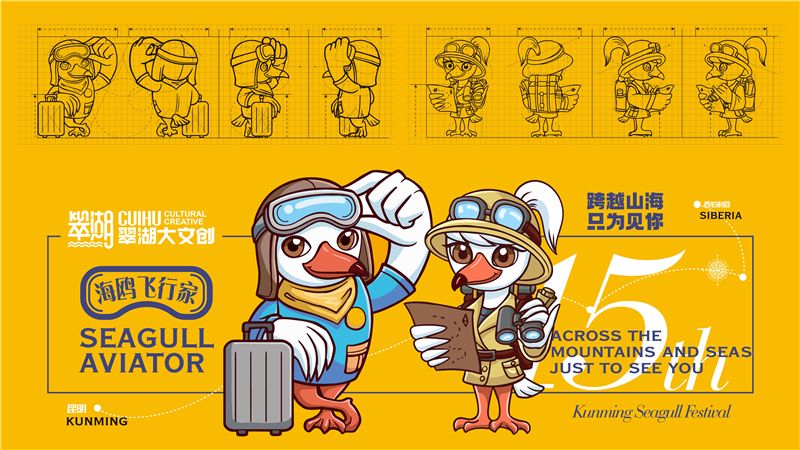 在发布的活动视觉系统中,名为“海鸥飞行家”的昆明海鸥文化节IP形象首次亮相。海鸥飞行家来源于2021金鼎奖文创大赛的获奖作品,通过对其进行三维建模渲染,延展出不同的角色属性。