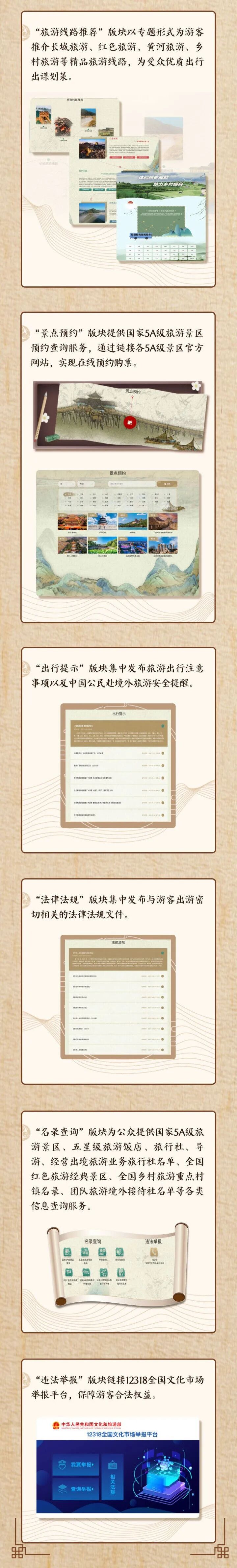此次上线“大众旅游服务”栏目对宣传推广大众旅游理念,全面深化政府信息公开具有重要作用。下一步,文化和旅游部将进一步优化栏目设置,丰富栏目内容,为大众提供持续、优质的旅游信息服务。