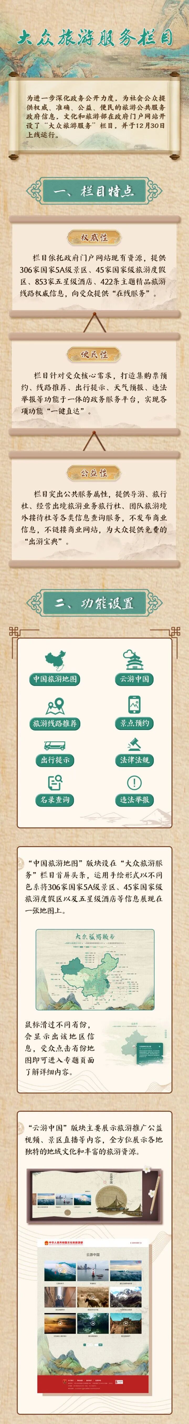 为进一步深化政务公开力度,为社会公众提供权威、准确、公益、便民的旅游公共服务政府信息,文化和旅游部在政府门户网站开设了“大众旅游服务”栏目,并于12月30日上线运行。