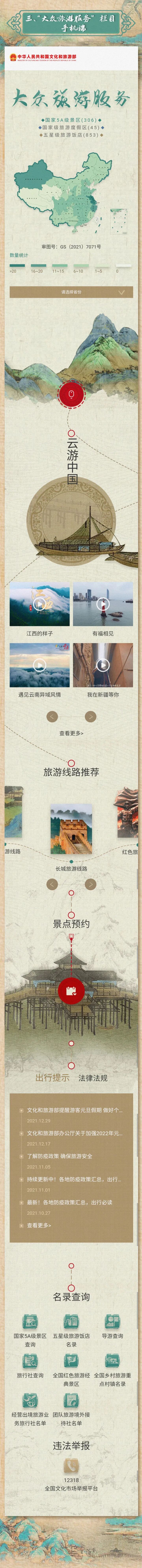 在功能设置方面,“大众旅游服务”栏目集资讯服务、购票预约、线路推荐、天气预报等功能于一体,设置“中国旅游地图”“云游中国”“旅游线路推荐”“景点预约”“出行提示”“法律法规”“名录查询”“违法举报”8个版块,通过文字、图片、视频等全方位展示各地独特的地域文化和丰富的旅游资源,以专题形式推荐红色旅游、乡村旅游、长城旅游、黄河旅游等共计422条精品旅游线路,及时更新景区、酒店、天气、交通等信息,全力打造便捷高效的政府信息服务平台。