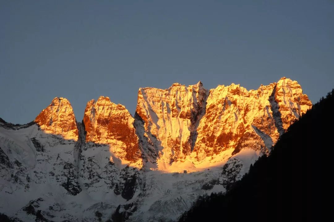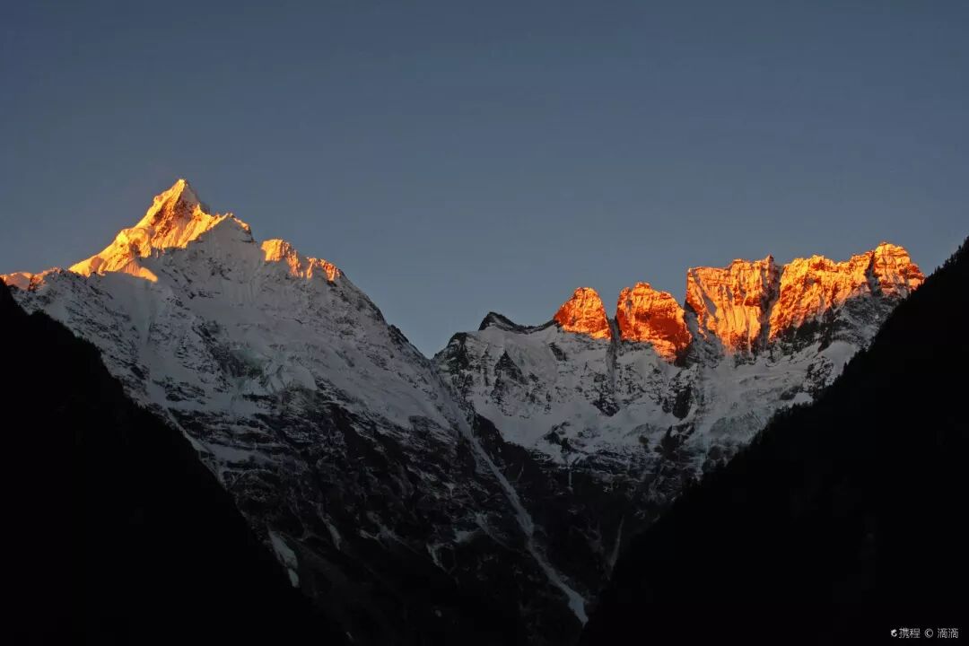 真正让飞来寺出名的是“日照金山”的景观,日出的时候,阳光洒在梅里主峰上,雪山仿佛放出金色的光芒,非常壮观。