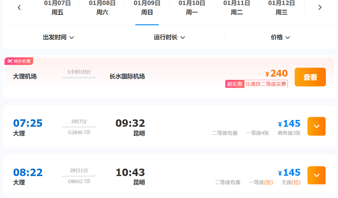 从行程上看,大理至昆明出发时查询的火车票价格最低为145元。