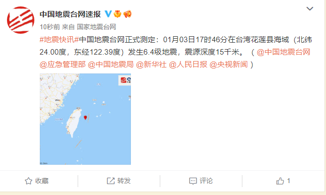 中国地震台网正式测定:1月3日17时46分在台湾花莲县海域(北纬24.00度,东经122.39度)发生6.4级地震,震源深度15千米。