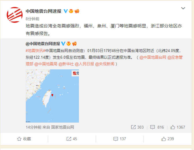 地震造成台湾全岛震感强烈,福州、泉州、厦门等地震感明显,浙江部分地区亦有震感报告。