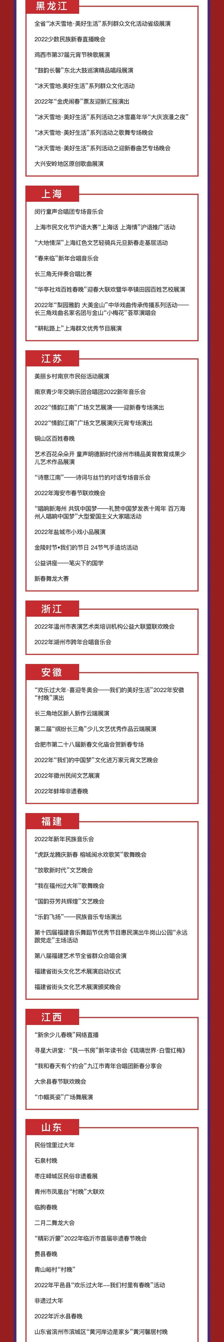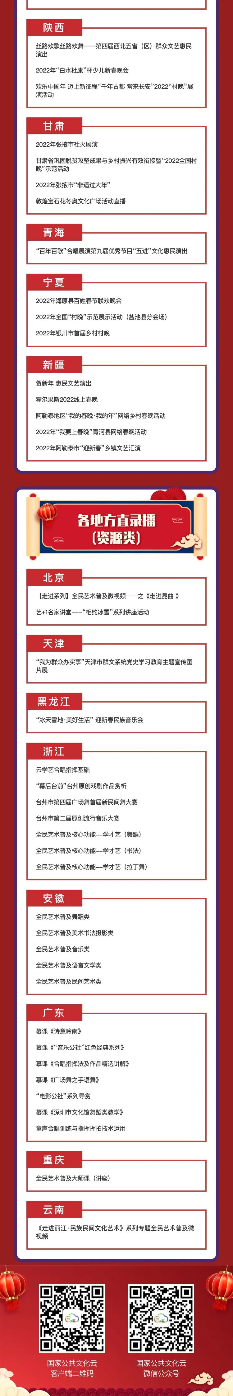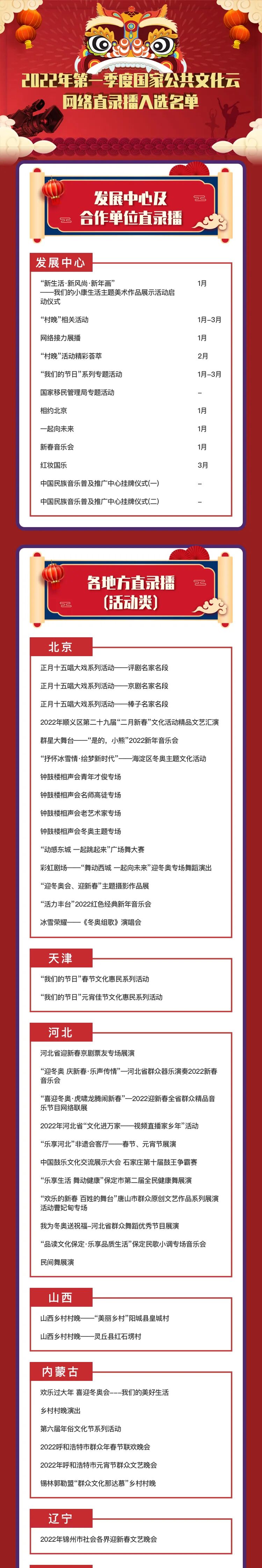 为贯彻落实《“十四五”公共文化服务体系建设规划》,推动国家公共文化云网络直录播高质量发展,深化供给侧结构性改革,提升人民群众文化获得感、幸福感,文化和旅游部全国公共文化发展中心(以下简称“发展中心”)组织开展了2022年第一季度国家公共文化云网络直录播遴选工作,经过各地报送和审核遴选,共有222个直录播纳入第一季度国家公共文化云播出计划,现予公布。