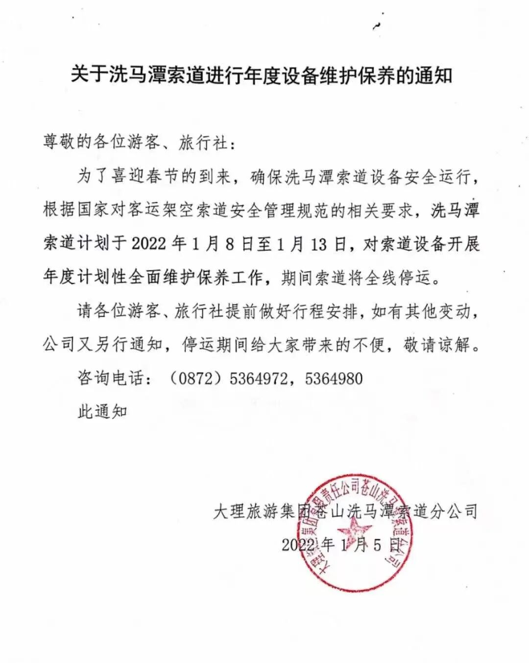 苍山洗马潭索道将全线停运维护保养,看雪景请安排好时间! 2022-01-05 19:59 大理旅游集团苍山洗马潭索道分公司 0 洗马潭索道计划于 2022年1月8日至1月13日 对索道设备开展 年度计划性全面维护保养工作 期间索道将全线停运 来源:大理旅游集团苍山洗马潭索道分公司 编辑 沈艺 审核 李元