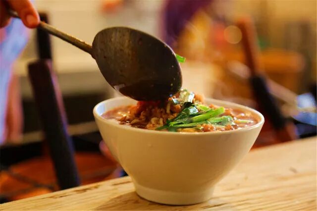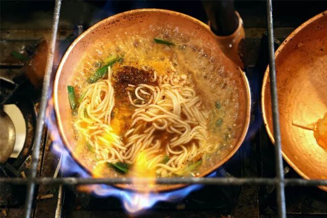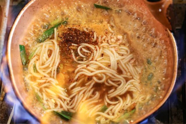 锃亮的铜锅用滚水清洗之后,放在大火上加入高汤,先放韭菜煮沸,再放米线,接着是肥瘦均匀的碎肉,放入锅边捣碎、煮熟,加入酱油、水腌菜、盐巴,最后浇上一勺麻辣红油……老冬家的小锅米线上桌了。