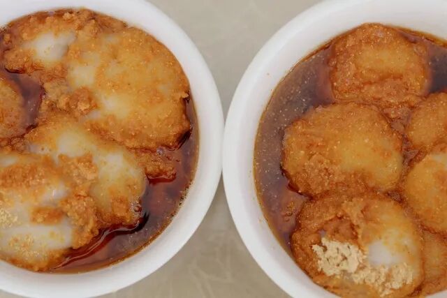 为了保证汤圆的糯滑口感,每天一“吊”是绝对不能马虎的。除此之外,原汁红糖、炒香的黄豆面、碎花生等都是吊浆汤圆所不能缺少的配料。