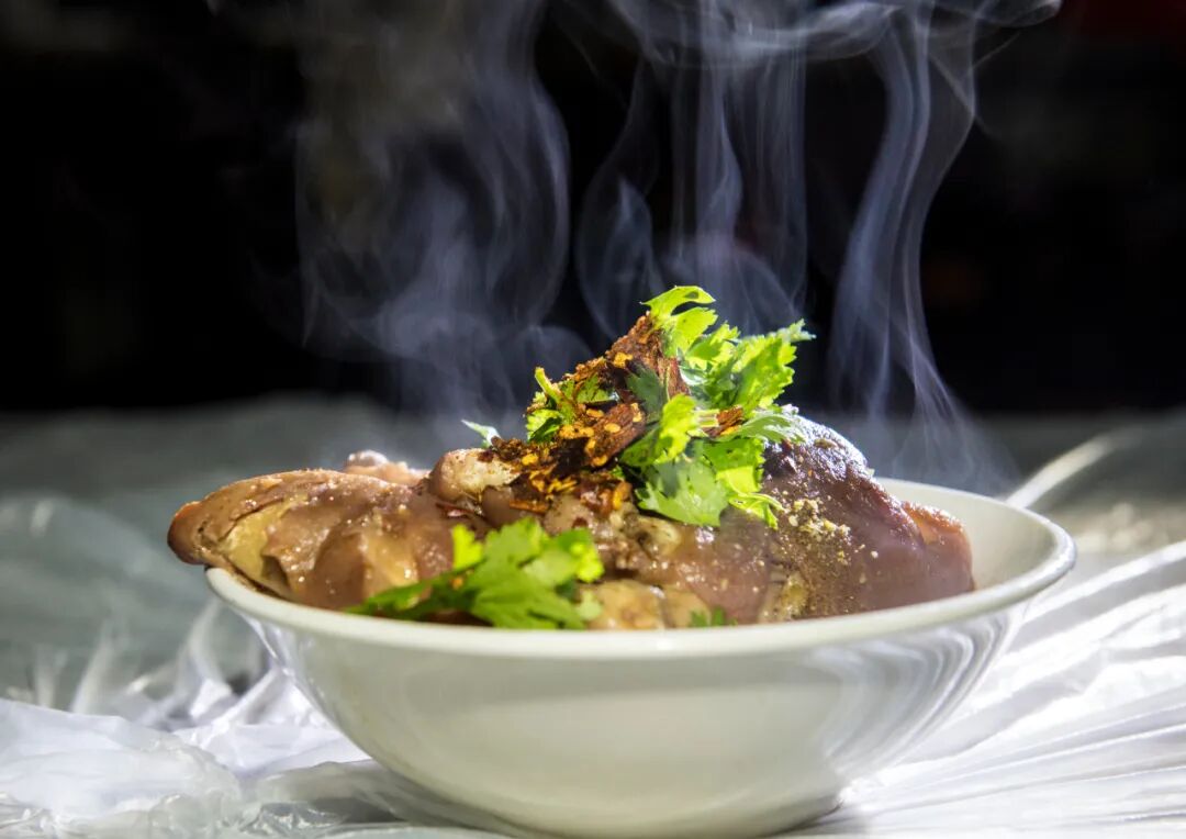 耙猪脚是澄江的传统美食,“火巴”字是澄江话形容食物煮的很软, 澄江的耙猪脚要煮4~5个小时,煮到皮肉和骨头很容易分开,入口即化,再配上红色的辣椒油、绿色的香菜,肉吃起来耙烂软糯、肥而不腻。