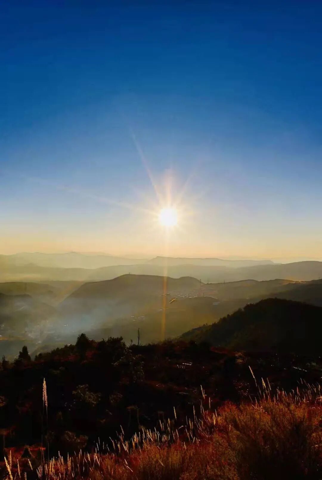 初升的朝阳驱散黎明前的昏暗,似一只明亮温柔的眼眸,凝望着渐渐清晰的大地。连绵起伏的山峰,从不同的角度看去,给人不同的印象,似人像,似动物,众多念头在脑海中闪过,赋予了这些峰峦鲜活的灵动气息。