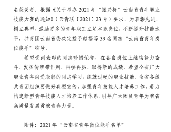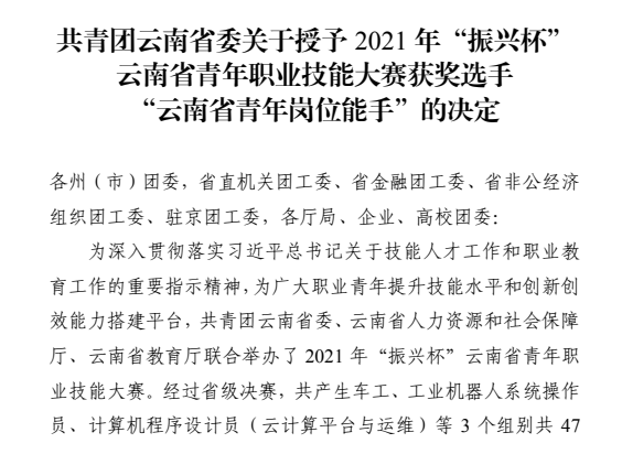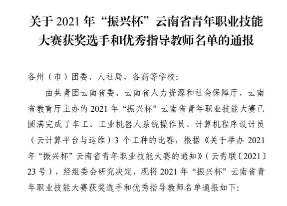 为深入贯彻落实习近平总书记关于技能人才工作和职业教育工作的重要指示精神,为广大职业青年提升技能水平和创新创效能力搭建平合,共青团云南省委、云南省人力资源和社会保障、云南省教育厅联合举办了2021年“振兴杯”云南省青年职业技能大赛。