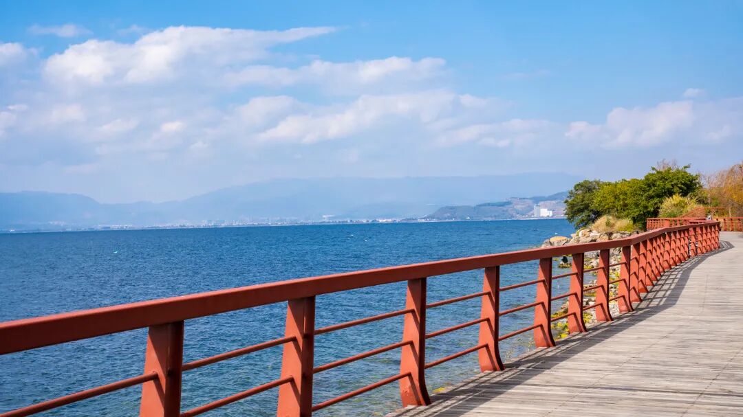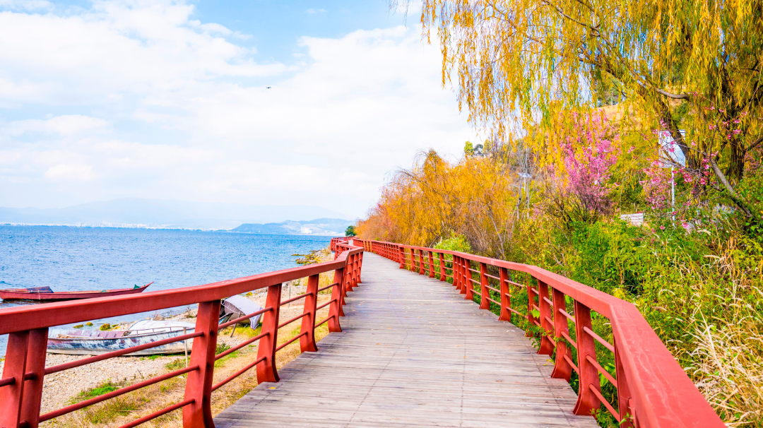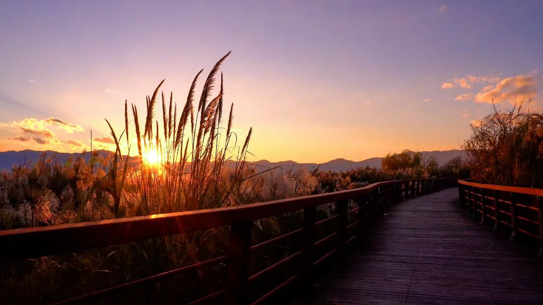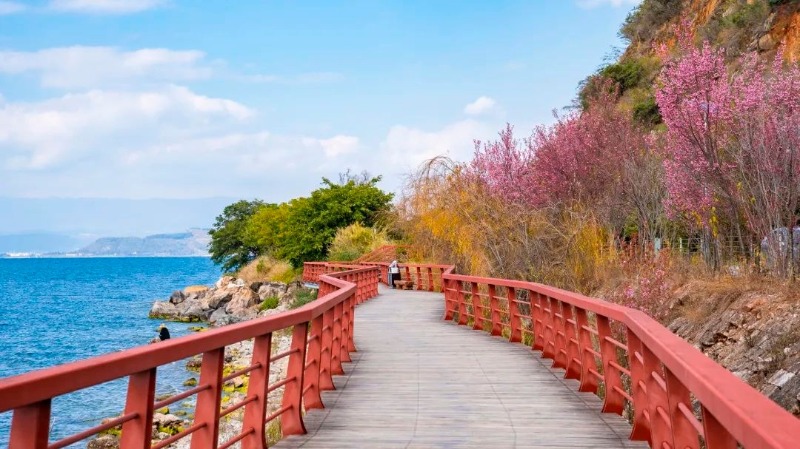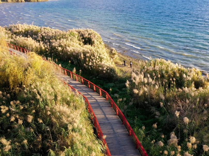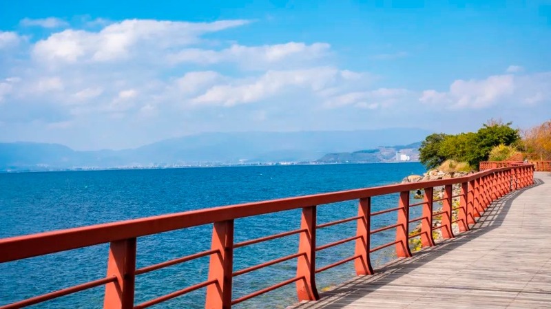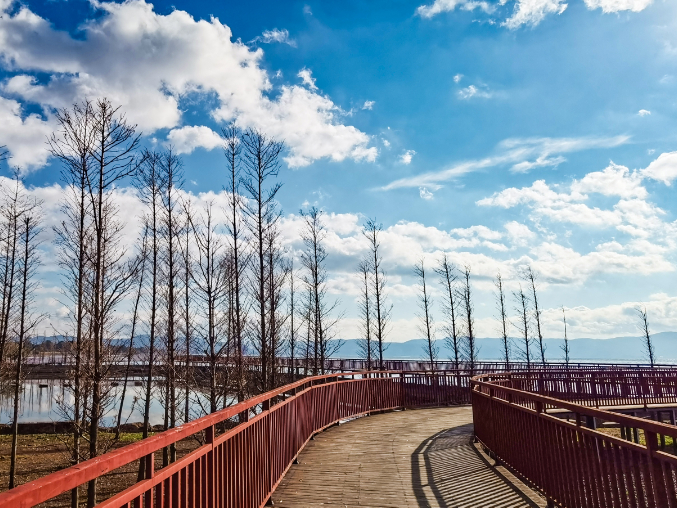 时光栈道是抚仙湖北岸的一条生态观光走廊,西起尖山小学,东至海口大石洞,全长约28公里,宽约3米,沿途穿过抚仙湖国家湿地公园、月亮湾湿地、樱花谷等地。时光栈道与沿途的树林、沙滩、怪石等融为一体,行走其中看湖、听风、观景,抚仙湖的美景尽收眼底,一览无遗。