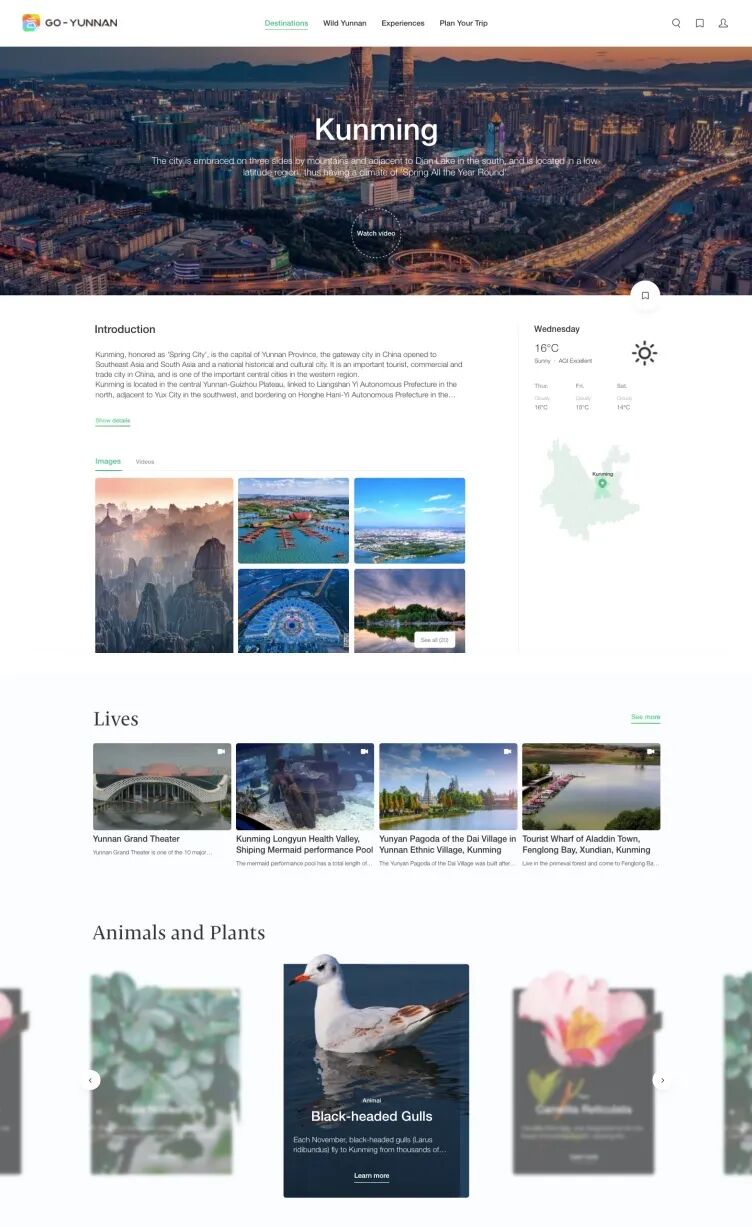 在“Destinations”(目的地)模块,云南十六州市的城市名片和景区名片进行了全新升级。用户可通过阅读图文、观看直播、浏览图片和视频的方式,直观感知和了解云南各地的著名景点、特色动植物以及旅游攻略、周边城市、目的地涉外酒店等信息。