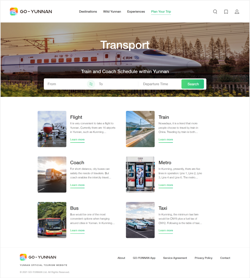 ——Transport:交通板块包含云南省内火车和汽车时刻查询、主要公共交通工具介绍等功能,为外国旅客出行提供便利;