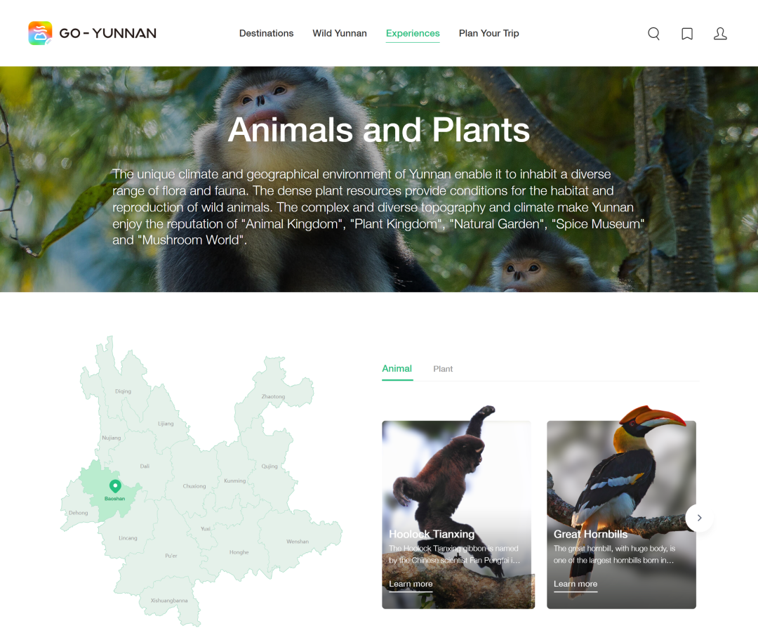 “Experiences”(探索体验)模块从COP15、非遗、古镇、温泉、少数民族、世界遗产、动植物王国、生物多样性等近20个方面,多维度聚合旅游资讯,集中推介云南最具特色的文旅资源。