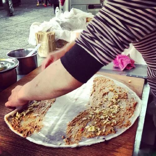 板桥凉卷粉的配料并无特别,却风味十足。甜咸酱油、油辣椒、花生酱、大蒜水、酸泡菜、花椒油,最后再加上一点碧绿的韭菜。一碗相思,尽难忘。