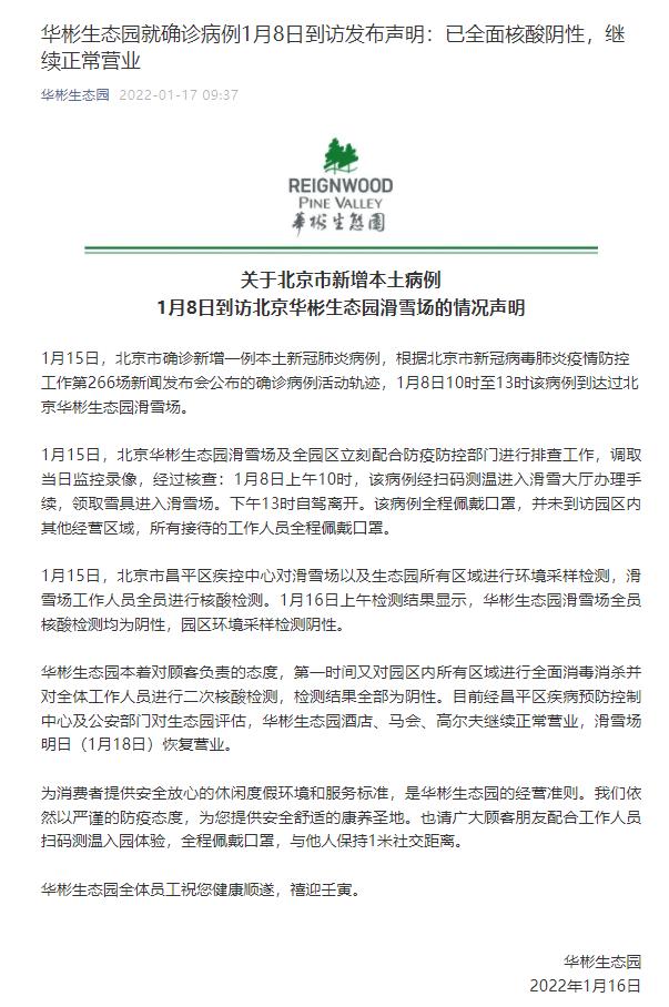 华彬生态园本着对顾客负责的态度,第一时间又对园区内所有区域进行全面消毒消杀并对全体工作人员进行二次核酸检测,检测结果全部为阴性。目前经昌平区疾病预防控制中心及公安部门对生态园评估,华彬生态园酒店、马会、高尔夫继续正常营业,滑雪场明日(1月18日)恢复营业。
