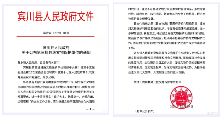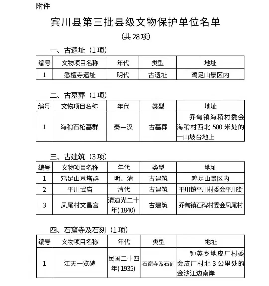 2021年12月29日,宾川县人民政府公布了第三批县级文物保护单位,共28项,涵盖古遗址、古墓葬、古建筑、石窟寺及石刻、近现代重要史迹及代表性建筑等类别。至此,宾川县经各级人民政府公布的文物保护单位已达66项,其中国家级2项,省级6项,州级15项、县级43项。