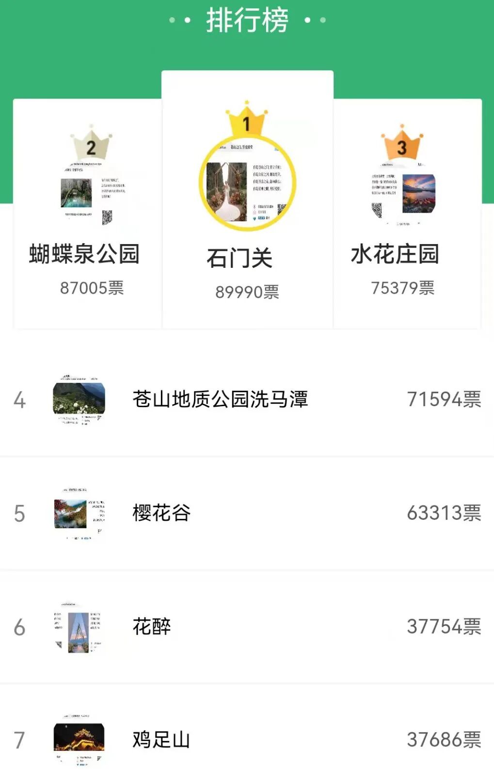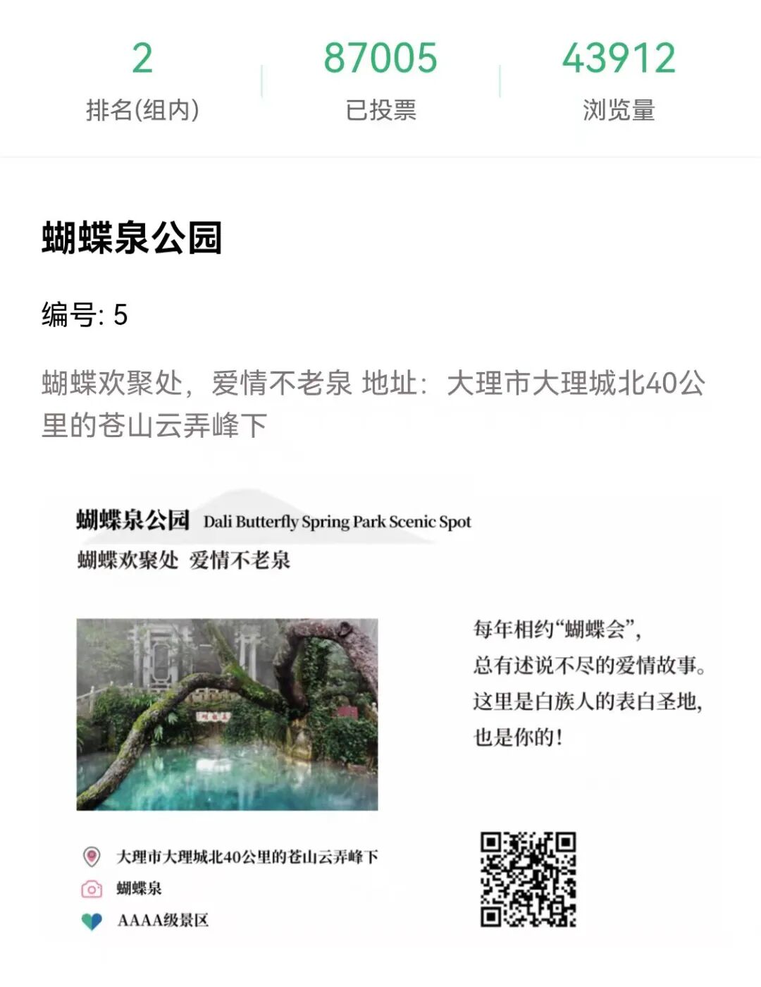 2021年12月27日0点到2022年1月10日18:00,为期15天的大理最佳爱情表白地网络投票评选活动圆满落幕,其中,大理最佳爱情表白地——蝴蝶泉公园“蝴蝶欢聚处·爱情不老泉”,被网友投票以87005票评选为网络评选环节的第二名。