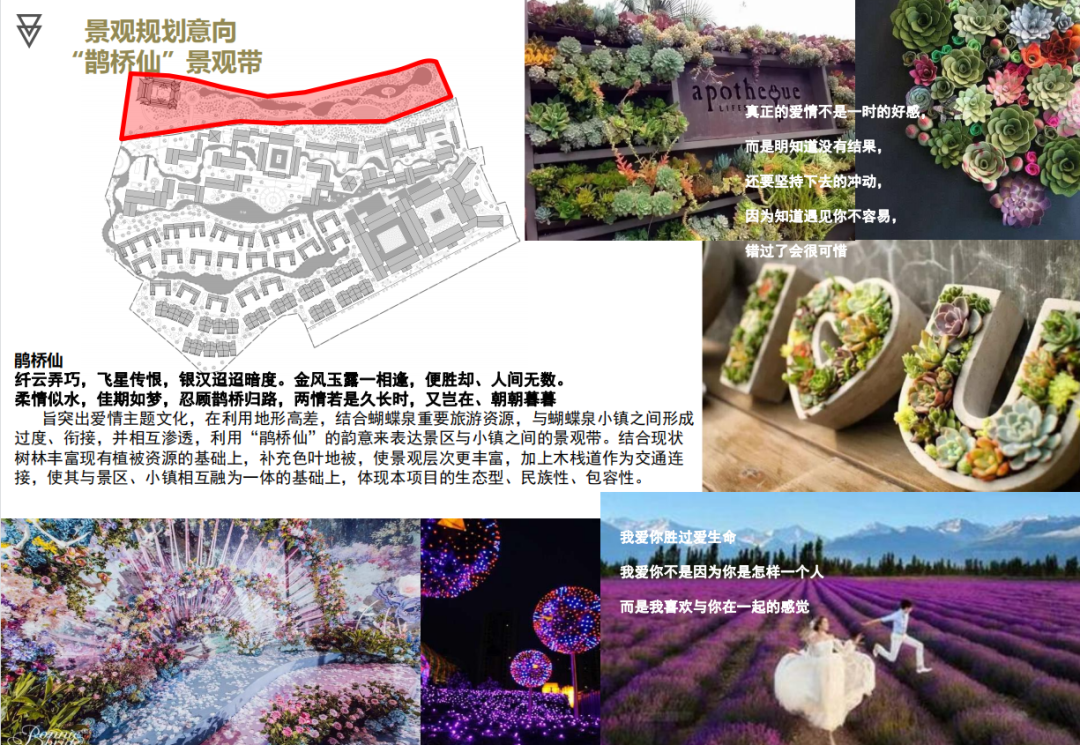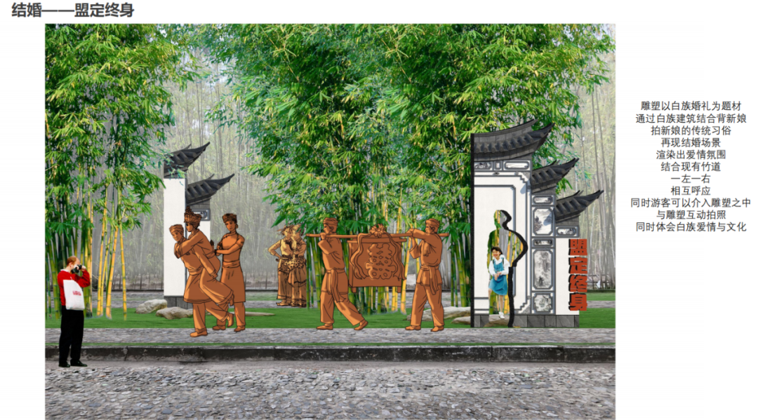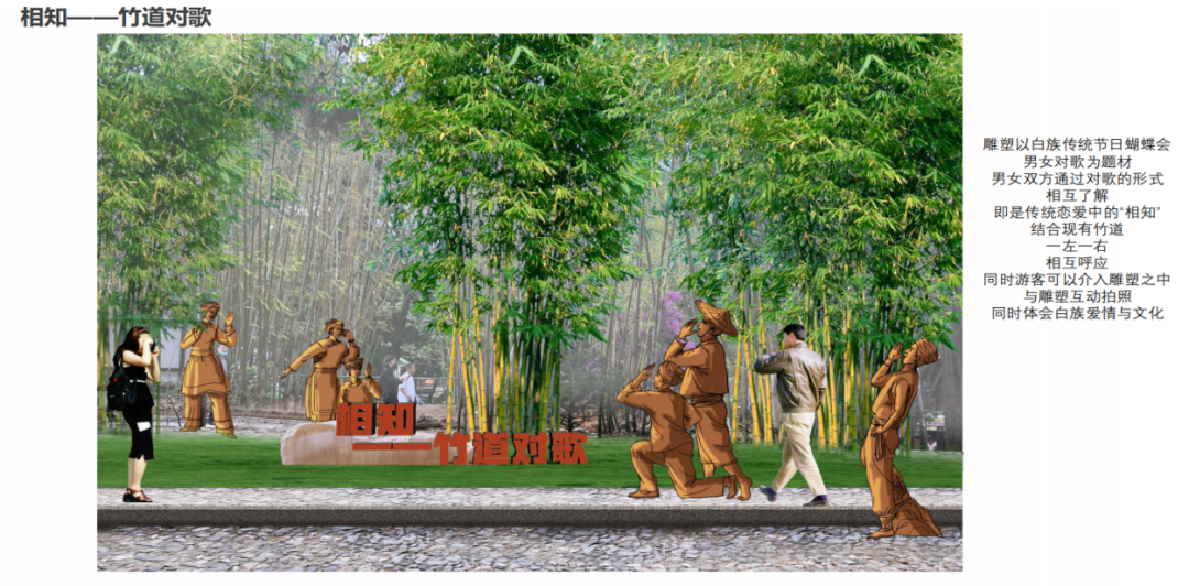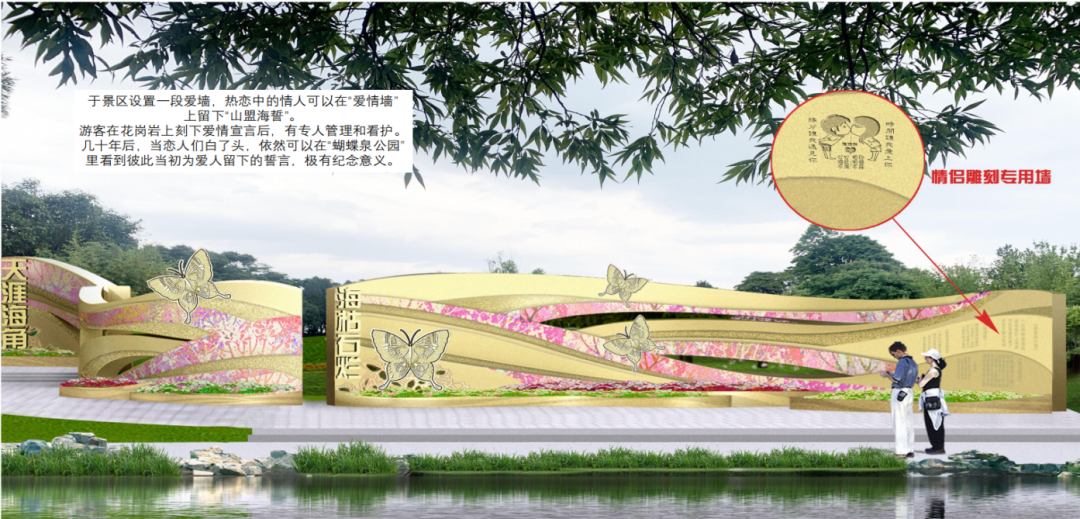 3、以蝴蝶泉为背景,以爱情为主题,设计景观雕塑,将整个园区分为入口印象区、白族风情区、专属记忆区、历史典故区、现代体验区,通过总体构想、空间布局、形态营造、再现历史、突出主题、传唱爱情、承古启今营造爱情主题雕塑,以体现白族文化的爱情婚恋、不同年代的爱情美好印象、爱情表达方式和定情信物、婚龄探秘、现代爱情存储保有方式……一路走来长长的爱情足迹、文化记忆!