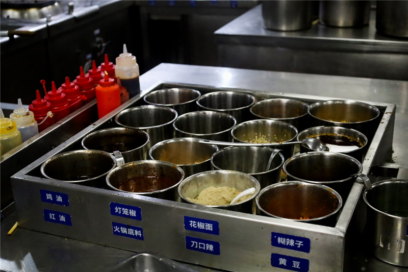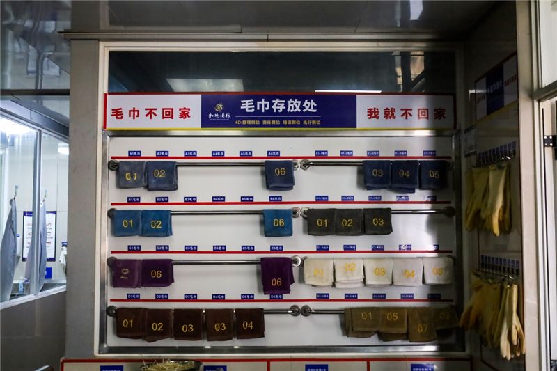 “4D厨房”里每一个区域分工明确,不同的工作人员根据分工分为砧板组、凉菜组、面点组等,在配菜区、炒菜区、配料区及面食房各司其职。餐厅工具、毛巾、通讯工具都有各自的存放处,“毛巾不回家,我就不回家”醒目的标语彰显了酒楼认真的态度。