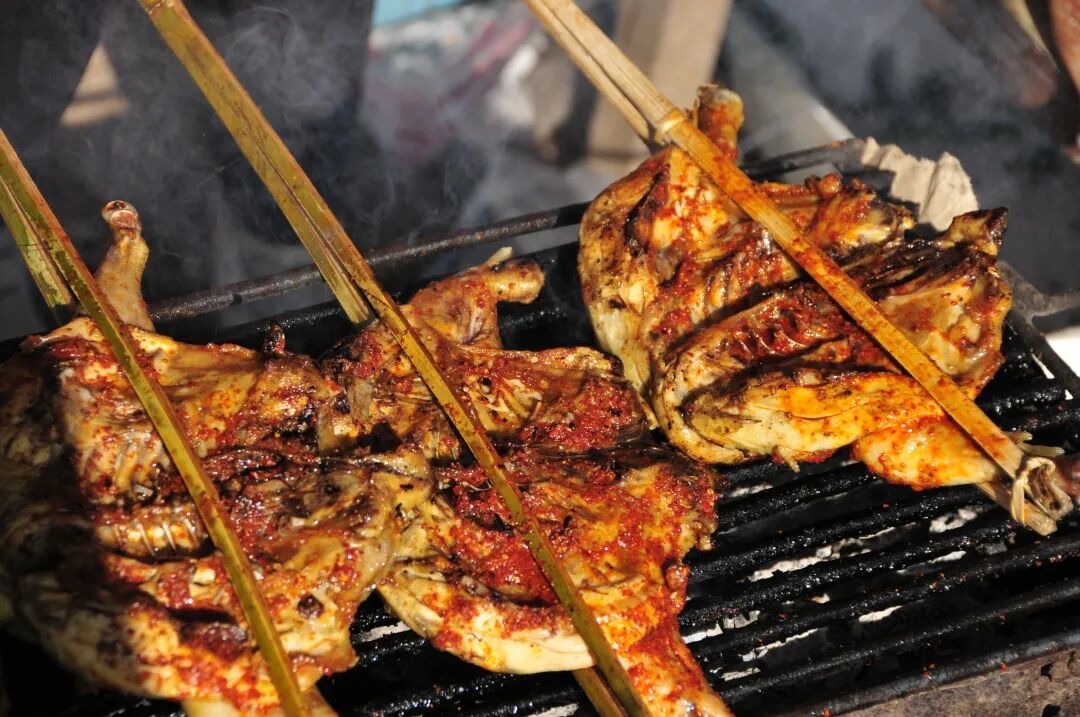 烤鸡是传统傣家烤制菜系里最具特色的菜品,烤鸡体型不大,烤过的鸡肉外焦里嫩,色泽诱人,是傣家饭桌上最常看到的菜品。勐海烤鸡香而不腻,配合传统蘸料蘸食,更是香辣美味,和三五好友一起点上几只,就能感受大口吃肉大口喝酒的快感。
