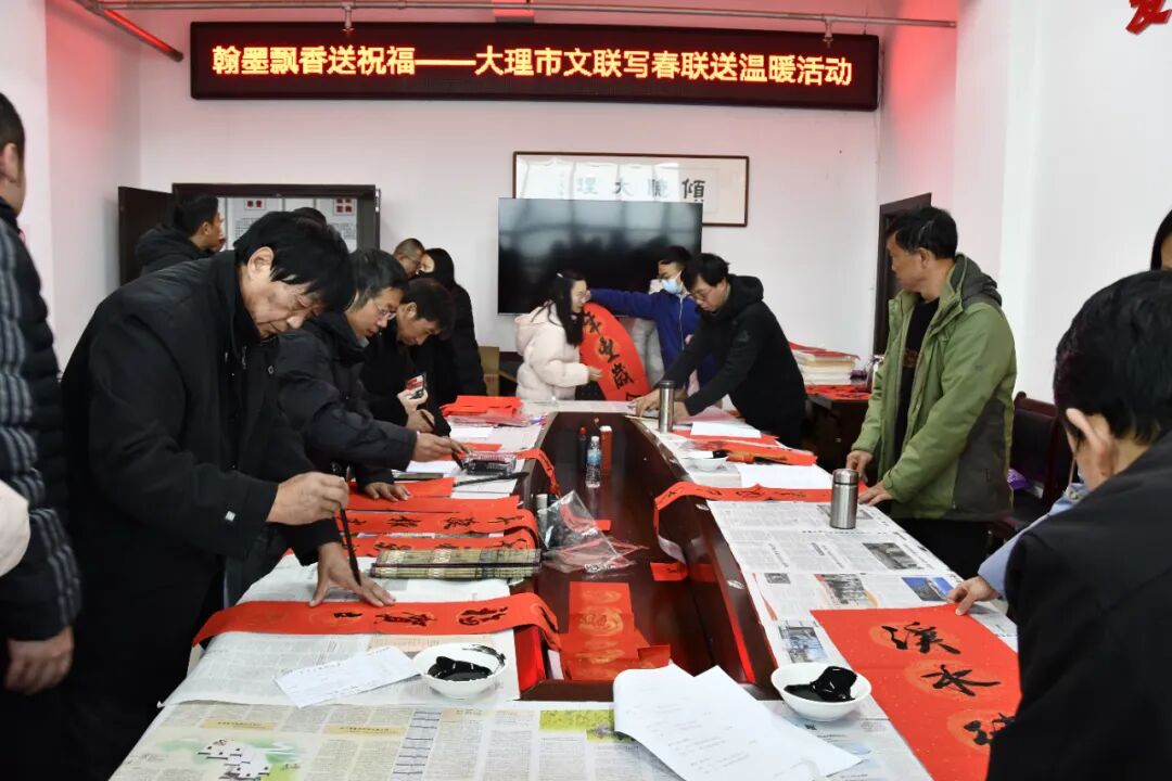 壬寅年春节来临之际,为深入贯彻落实习近平新时代中国特色社会主义思想和党的十九届六中全会精神,充分挖掘传统节日的精神内涵,营造吉祥如意的春节氛围、弘扬向上向善的道德风尚,将社会主义核心价值观融入民俗活动。近日,大理市文联、市书法家协会部分会员在市文联会议室开展了“翰墨飘香送祝福——大理市文联写春联送温暖”活动。