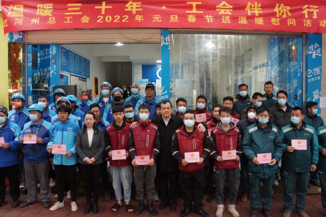 春节将至,岁寒情深。近日,红河州总工会党组书记、常务副主席张艳梅率慰问组到河口县、开远市走访慰问强边固防突击队员、新就业形态劳动者、困难职工、省部级劳模及坚守岗位一线职工,切实把党和政府的关怀以及工会的温暖送到职工心坎上。