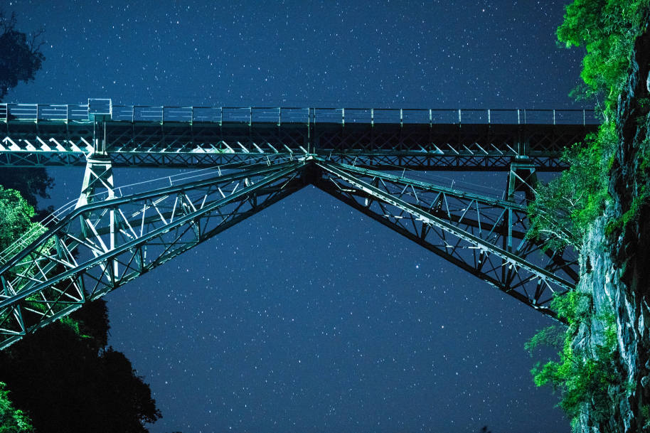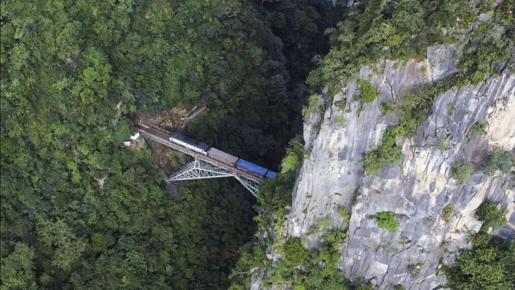 滇越铁路上有一座标志性的桥梁——人字桥。人字桥重179.5吨,距谷底高达102米。这座桥上不沾天,下不落地,无论从哪个角度看过去,都非常壮观。
