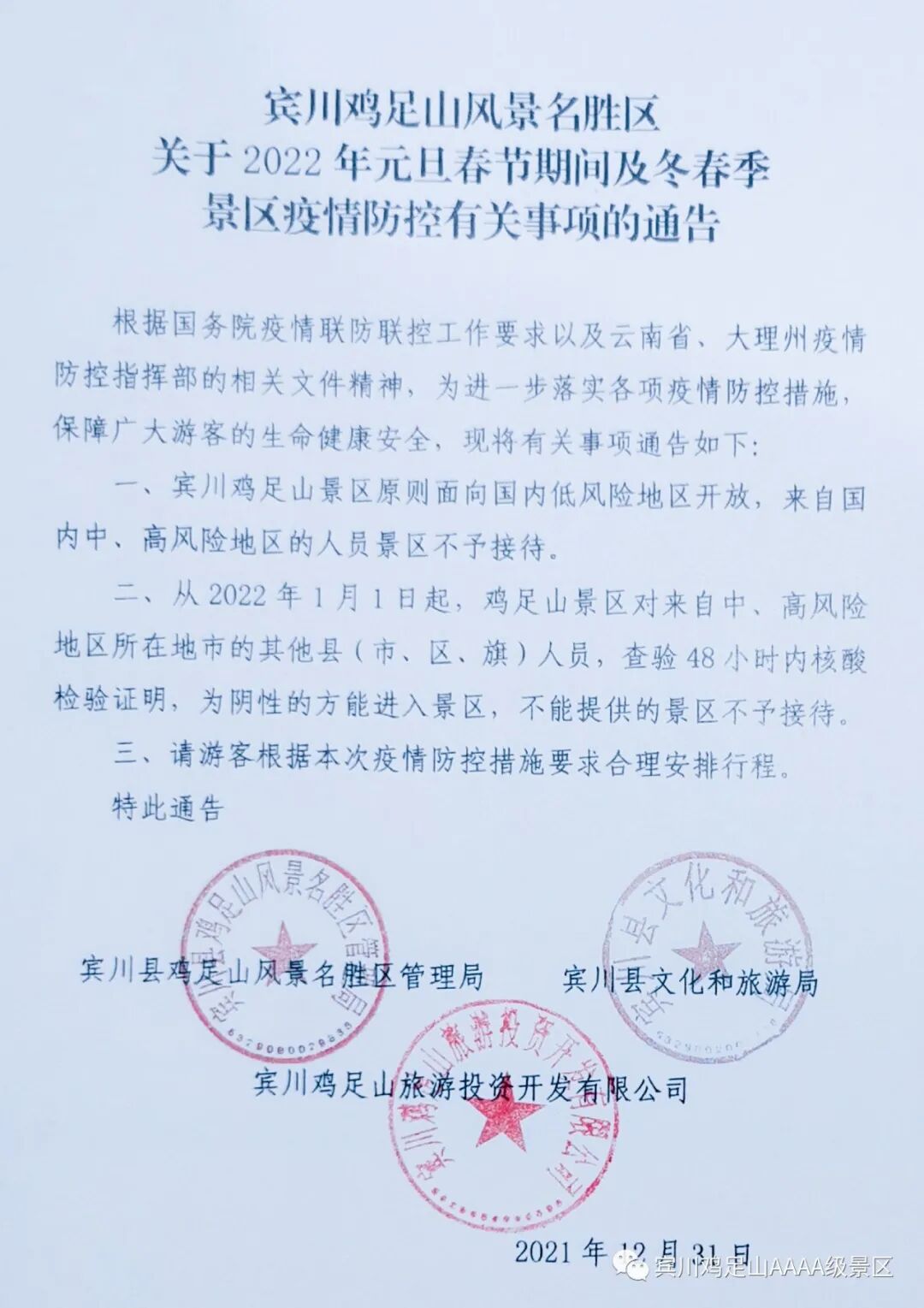 春节假日期间,出游鸡足山的游客朋友,以下通告很重要,请知悉!