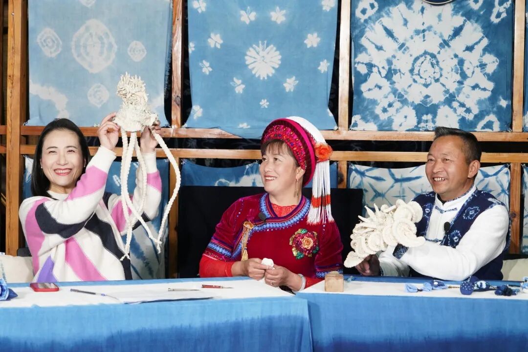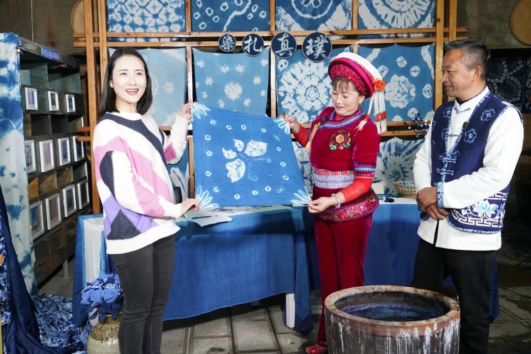 白族扎染技艺国家级代表性传承人段银开、省级代表性传承人段树坤夫妇为观众展示白族扎染技艺,受到了直播间观众朋友们的高度关注和喜爱。流传两千多年的白族扎染技艺,具有较高的历史文化价值和艺术价值。夫妇俩展示了亲手制作的扎染布料,同时对制作技艺、工艺流程和技法要点进行了专业讲解和详细解读。蓝与白为主的扎染色调,在穿着白族传统服饰的传承人手中变得更加旖旎、更加美丽。在二人的精心讲解中,观众看到了云南非遗的魅力,感受到云南非遗正在乡村振兴的大背景下创新发展,体会到了云南优秀传统文化的枝繁叶茂和源远流长。