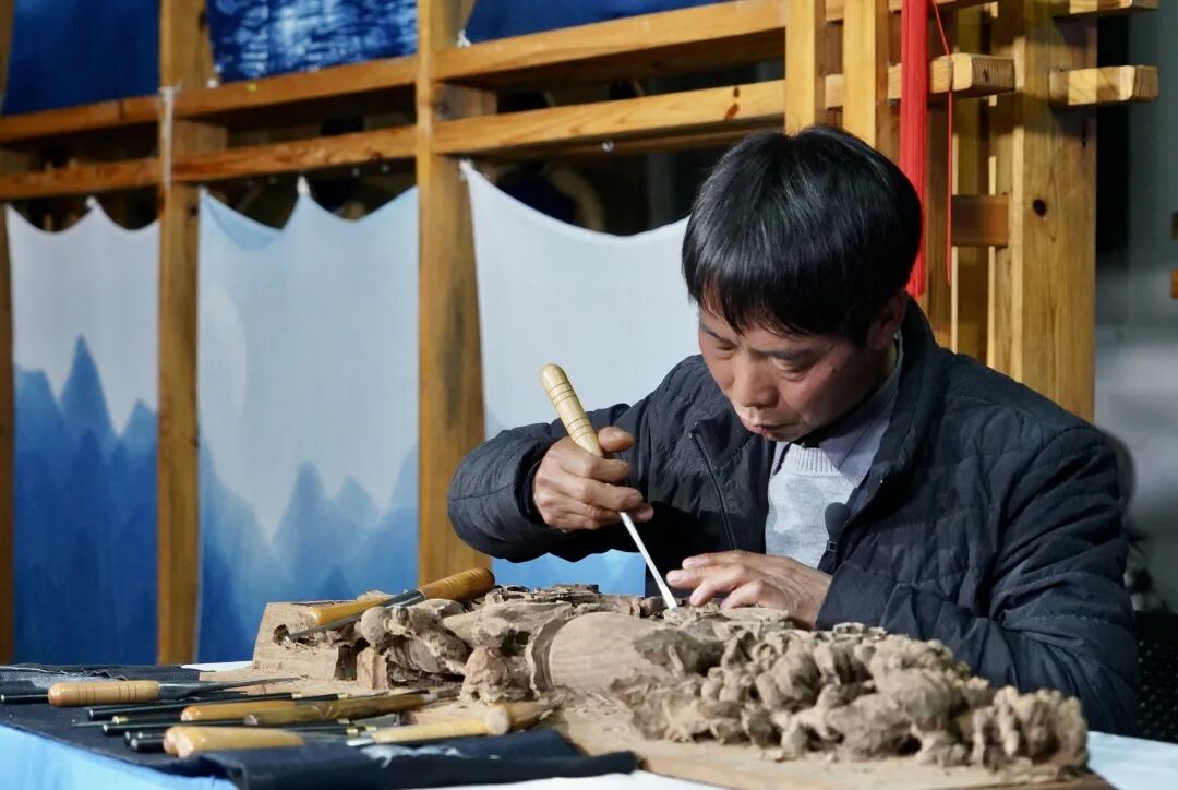 在剑川木雕展示环节,施家顺、施彬林父子现场展示了剑川木雕技艺。剑川木雕充分展现了白族人民高度的艺术水平和文化涵养,它以其精美绝伦的手工技艺扬名天下,其风格既有北方的豪放,也有江南的细腻,成为全国木雕的重要派别之一。传承人为我们展示了其最为得意的作品,一度让直播间的在线观众们拍案叫绝,感叹剑川木雕技艺的鬼斧神工。